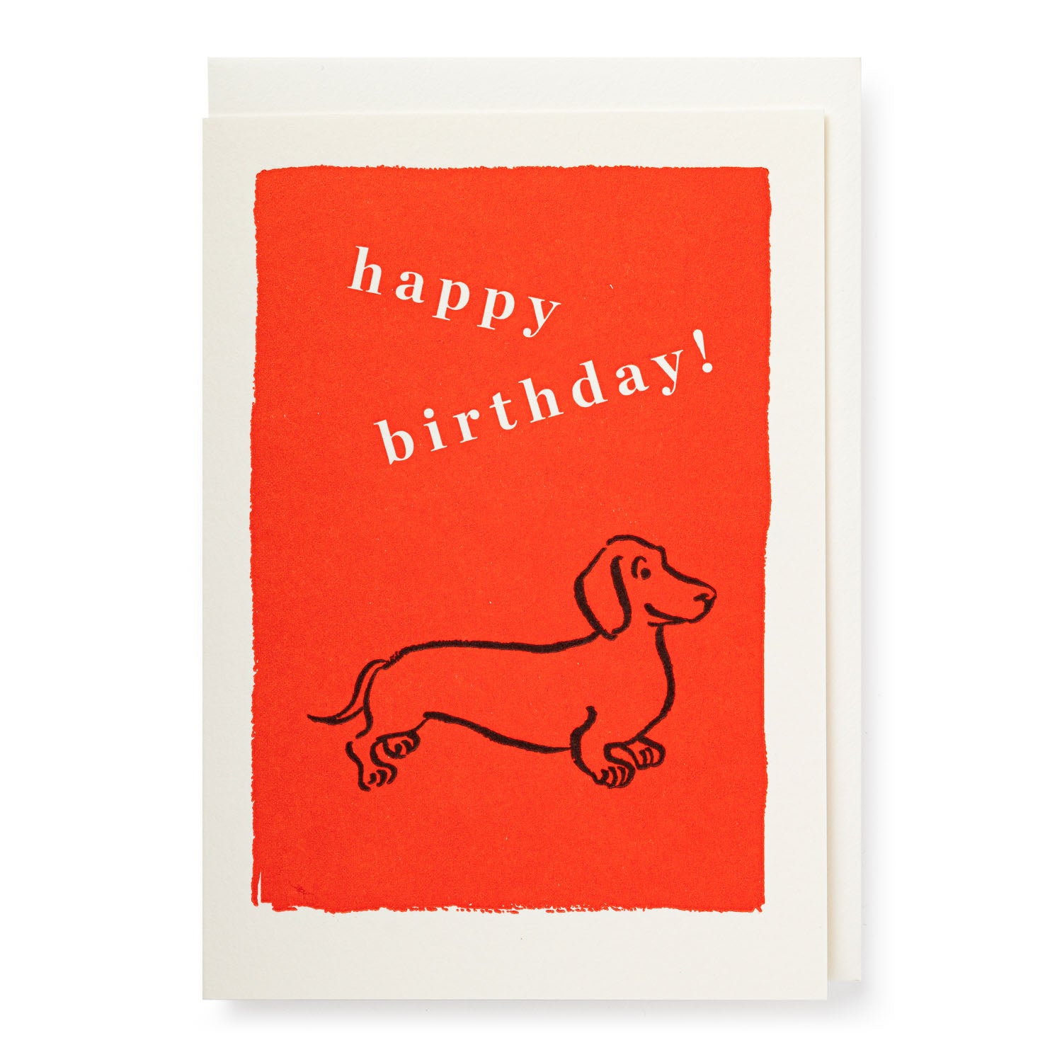 "Happy Birthday" Hot diggedy dog! Another birthday to celebrate! What better way to wish them congratulations (and celebrations) than with England's fifth favourite four legged friend, the dachshund of course. Featuring the majestic miniature pooch against bright red ink, J.Falkner's sausage dog card is sure to bring a smile to any dog lover's face on their special day.