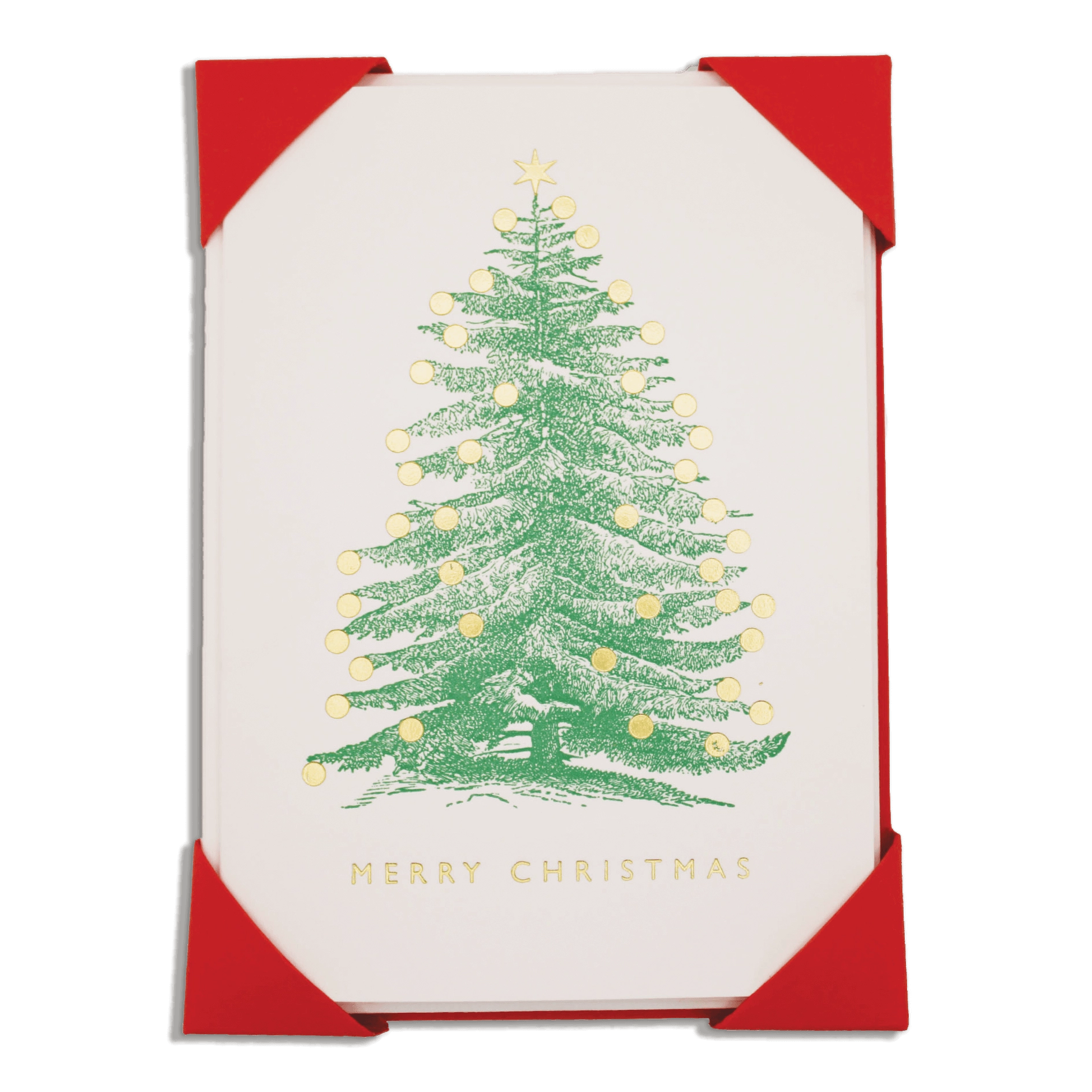 Our small letterpress card featuring a green Christmas tree adorned with gold foil baubles.