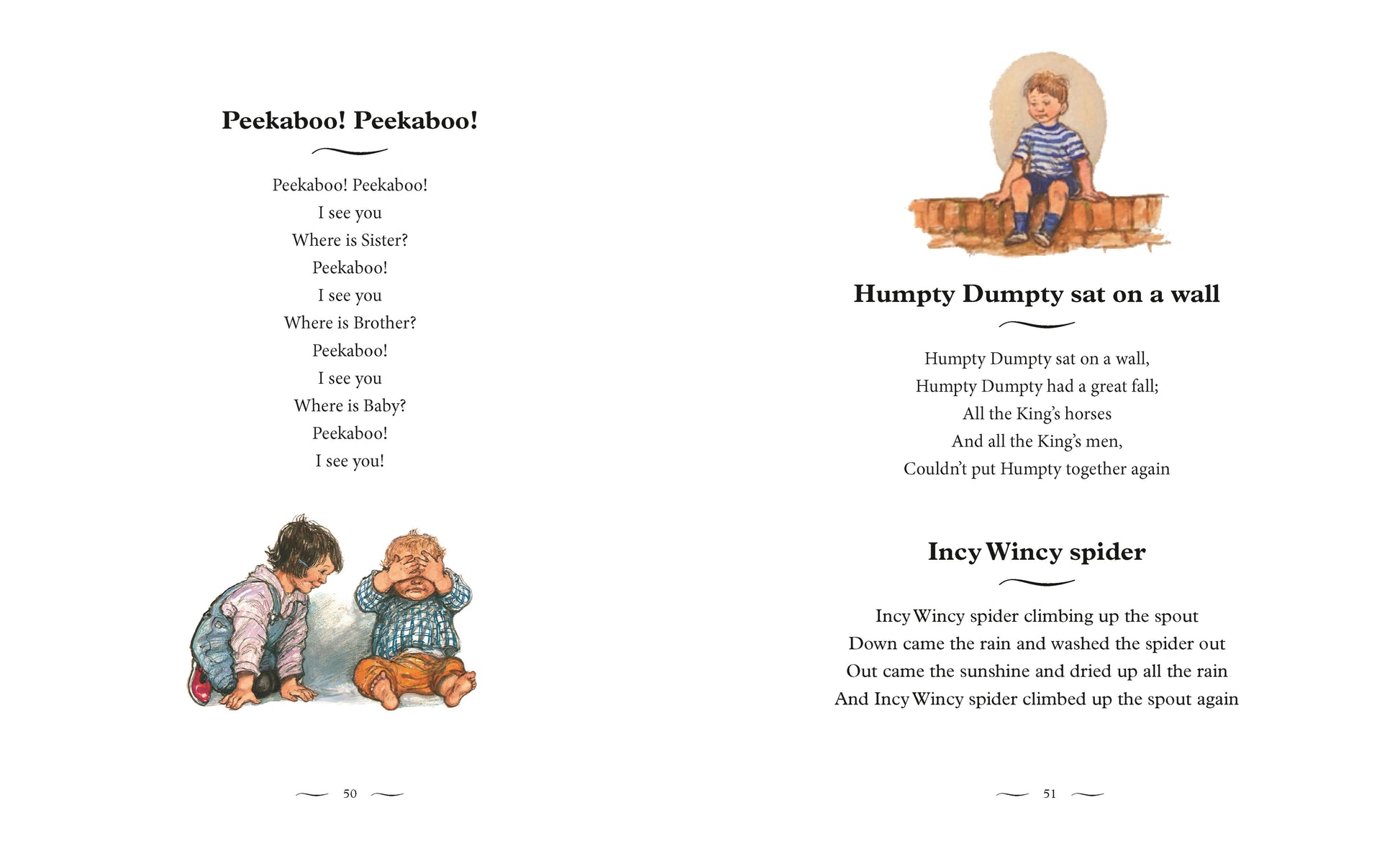 Parents and children can enjoy these rhymes all through the day: from walking to the park on a cold and frosty morning with 'Here we go round the mulberry bush' to going to bed with 'Twinkle, Twinkle Little Star'.