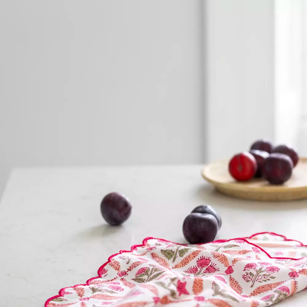 Scalloped Himalayan Wildflowers Pink Hand Block Print Napkin - Set of 4